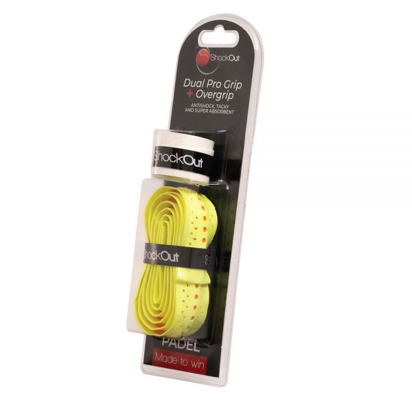Disfruta un juego lleno de comodidad con el nuevo grip Shockout Dual pro en color amarillo con naranja destinado a los jugadores profesionales que buscan proteger sus palas de las abrasiones.