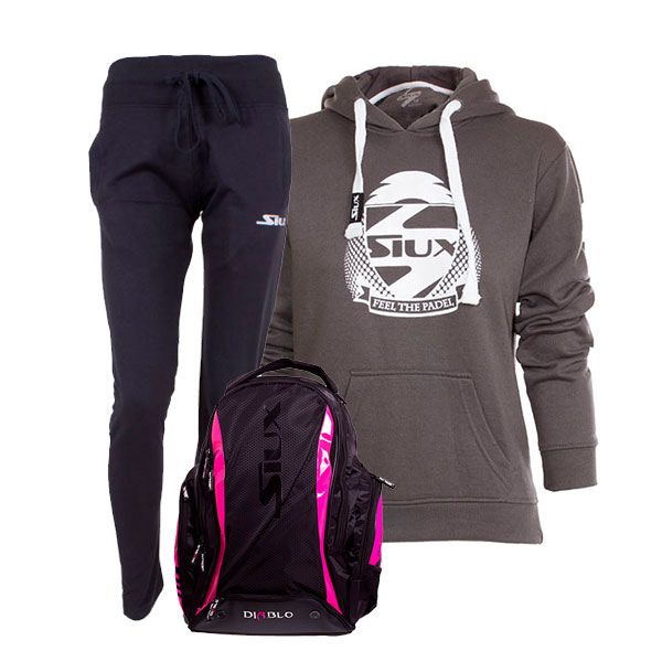 PACK SIUX MOCHILA DIABLO FUCSIA PANTALON AZUL Y SUDADERA BELICE MUJER GRIS