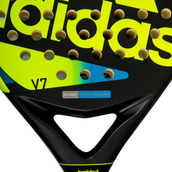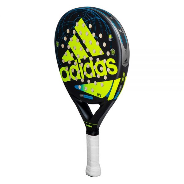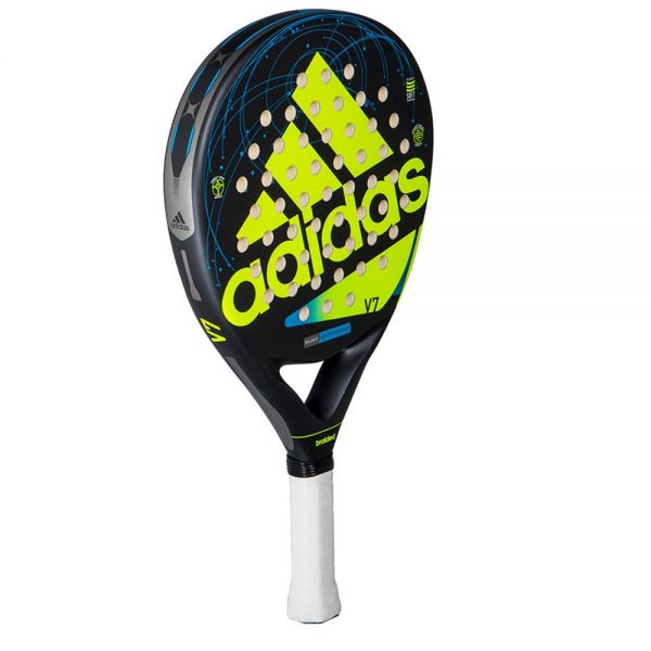 La adidas V7 se convierte fácilmente en una de las mejores palas para jugadores principiantes e intermedios. Es una pala de control que propicia el juego cómodo y manejable para los jugadores que apenas están desarrollando sus habilidades. Sus características técnicas como materiales y tecnologías la convierten en una de las palas con mejor relación calidad – precio en su categoría. Una pala resistente, con una fibra de vidrio y una goma que proporcionan un golpeo cómodo y sin vibraciones, y que además enamora desde el primer momento con su diseño. Está destinada a ser una pala que logre quedarse para la historia.