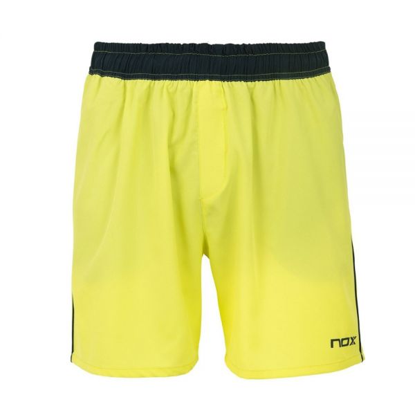 Experimenta la mejor comodidad con este pantalón corto Nox pro en color lima con azul ideal para los jugadores profesionales de padel.