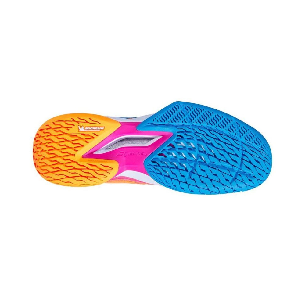Nuevas zapatillas de pádel Babolat Jet MAch 3 Ac en color rosa con azul para mujer, unas zapatillas perfectas y cuentan con un diseño atractivo para demostrar el poder femenino en tus partidos de pádel.